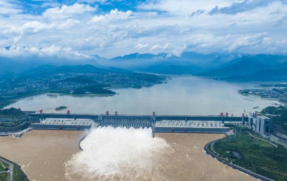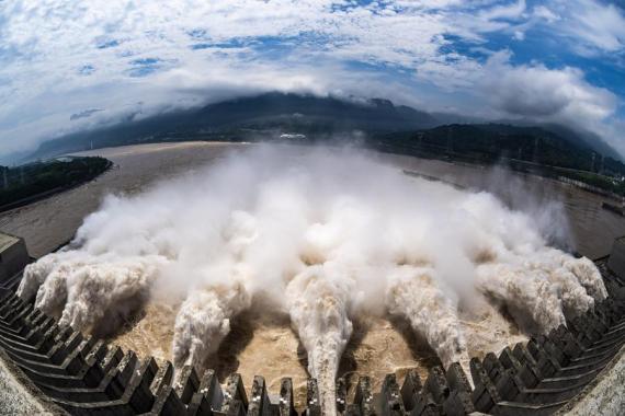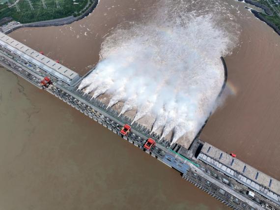 في الصور الملتقطة تدفق المياه من سد الخوانق الثلاثة عبر تسع من بوابات تصريف مياه الفيضانات بالسد الواقع في مقاطعة هوبي بوسط الصين، وذلك لتوفير المزيد من السعة لمواجهة الفيضانات القادمة من الروافد العليا لنهر اليانغتسي.