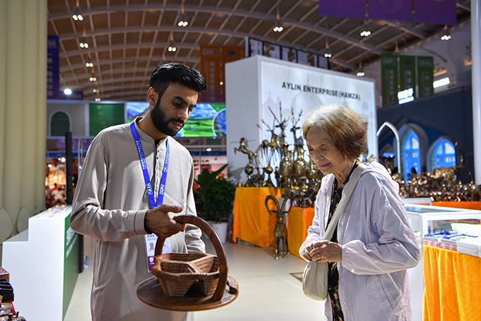 في الصورة الملتقطة أحد العارضين يقدم منتجا إلى أحد العملاء في معرض الصين-جنوب آسيا الثامن في كونمينغ بمقاطعة يوننان بجنوب غربي الصين.
