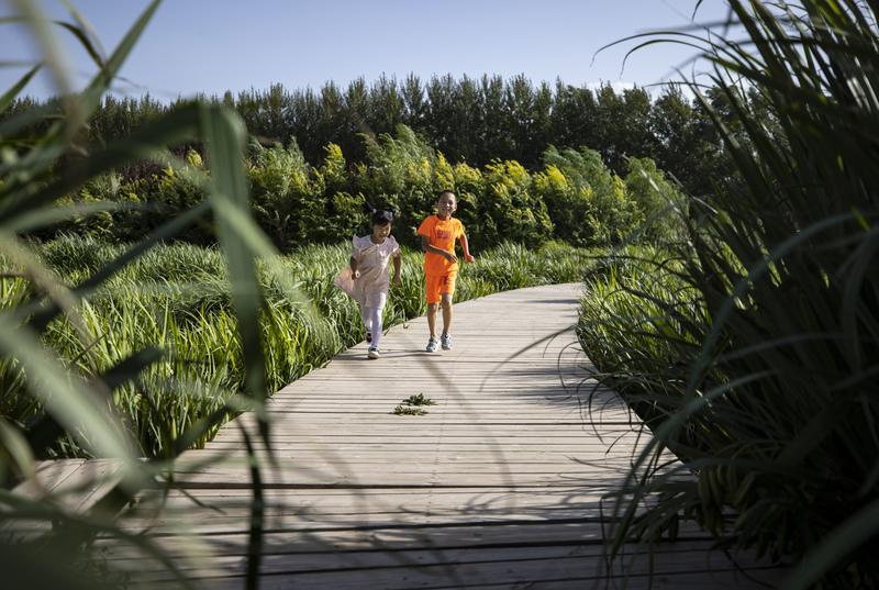 في الصورة الملتقطة سياح يزورون أرض قوتشنغوان الرطبة الاصطناعية في حي ليتونغ بمدينة ووتشونغ بمنطقة نينغشيا ذاتية الحكم لقومية هوي بشمال غربي الصين.