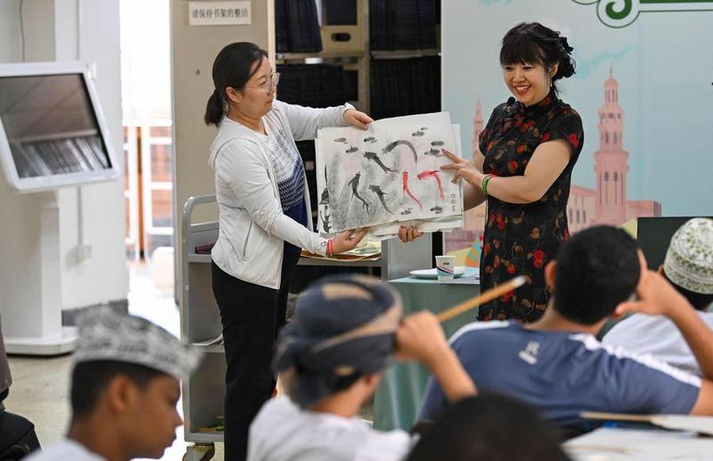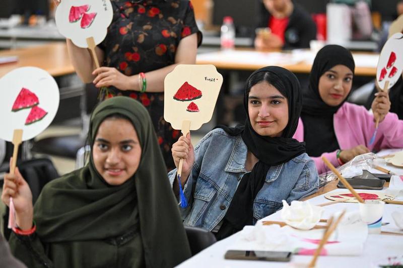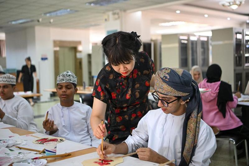 في الصورة الملتقطة معلمة صينية تقوم بإرشاد شباب عُمانيين لتجربة الرسم الصيني التقليدي في جامعة تيانجين للدراسات الأجنبية في بلدية تيانجين بشمالي الصين. ويشارك 22 من الشباب العمانيين في جولة دراسية لمدة أسبوعين في بكين وتيانجين لتجربة الثقافة الصينية.