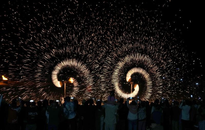 في الصورة الملتقطة فنانون شعبيون يطيرون الحديد المنصهر لتشكيل ألعاب نارية في هاييانغ بمقاطعة شاندونغ شرقي الصين.