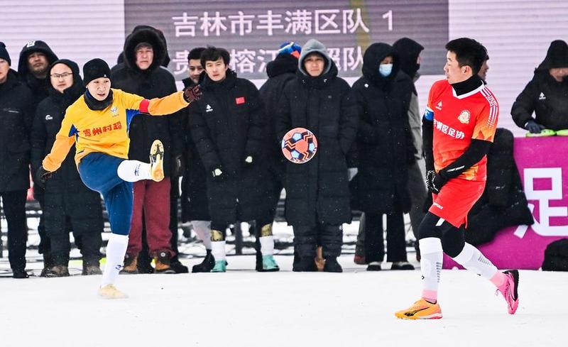في الصور الملتقطة لاعبون يتنافسون خلال مباراة كرة قدم ودية بين فريق كرة القدم لحي فنغمان التابع لمدينة جيلين وفريق “دوري القرية” لكرة القدم التابع لمحافظة رونغجيانغ بمقاطعة قويتشو بجنوب غربي الصين، حيث أقيمت المباراة على ملعب تغطيه الثلوج في قرية نانيانغ بمدينة شولان بمقاطعة جيلين بشمال شرقي الصين . وسافر فريق “دوري القرية” لكرة القدم من محافظة رونغجيانغ حوالي 3000 كيلومتر من جنوب غربي الصين إلى شمال شرقي البلاد لخوض مباراة أمام فريق القرية المحلي على ملعب تغطيه الثلوج. وفاز فريق كرة القدم لحي فنغمان لمدينة جيلين، الفريق المحلي، بالمباراة بنتيجة 5-1.