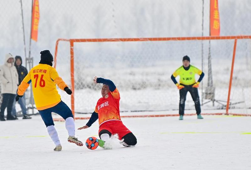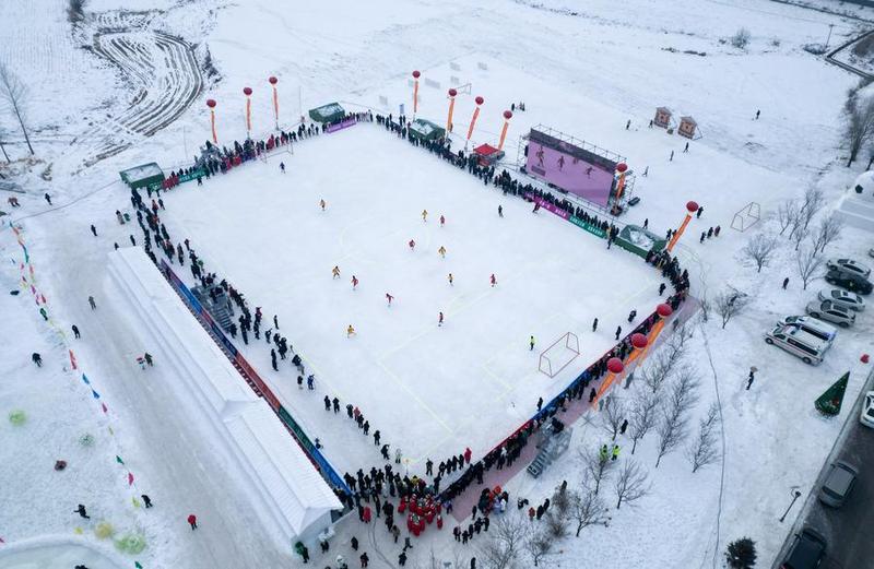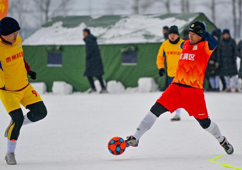 مباراة ودية لكرة القدم على ملعب تغطيه الثلوج بشمال شرقي الصين