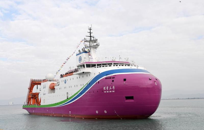 في الصور الملتقطة وصول السفينة “تان سوه سان هاو” أو “الاستكشاف رقم 3” متعددة الأغراض للاستكشاف العلمي والأثري في أعماق البحار إلى ميناء في مدينة سانيا بمقاطعة هاينان الجزرية بجنوبي الصين بعد تكليفها رسميا.