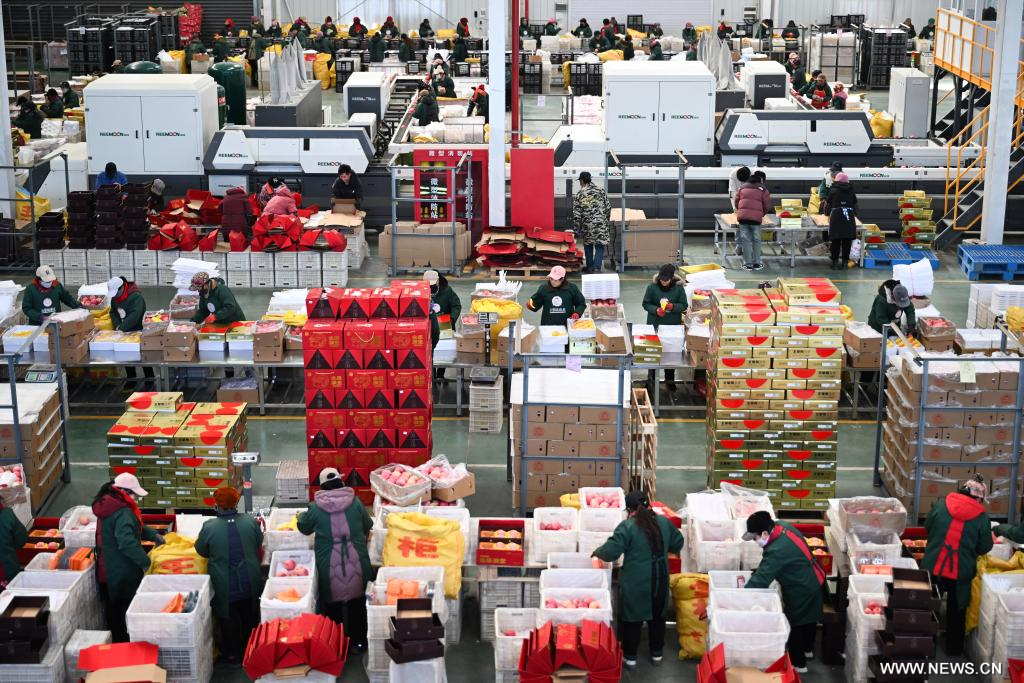 في الصورة الملتقطة موظفون يعملون على خط إنتاج في شركة لتعبئة الفواكه في محافظة لوهتشوان بمقاطعة شنشي شمال غربي الصين. شهدت محافظة لوهتشوان حديثا موسم ذروة مبيعات التفاح. تقع المحافظة على هضبة اللوس، وتتمتع بتربة مناسبة لزراعة التفاح. في عام 2024، بلغ إنتاج التفاح في محافظة لوهتشوان حوالي 1.14 مليون طن.