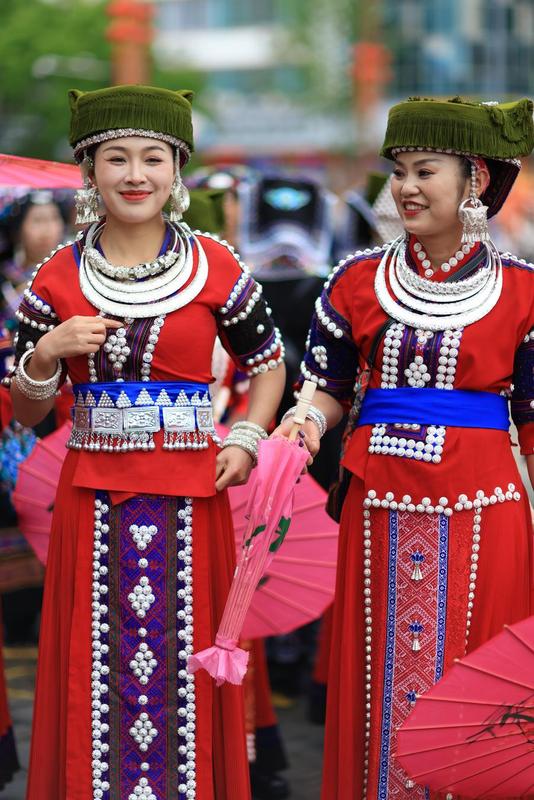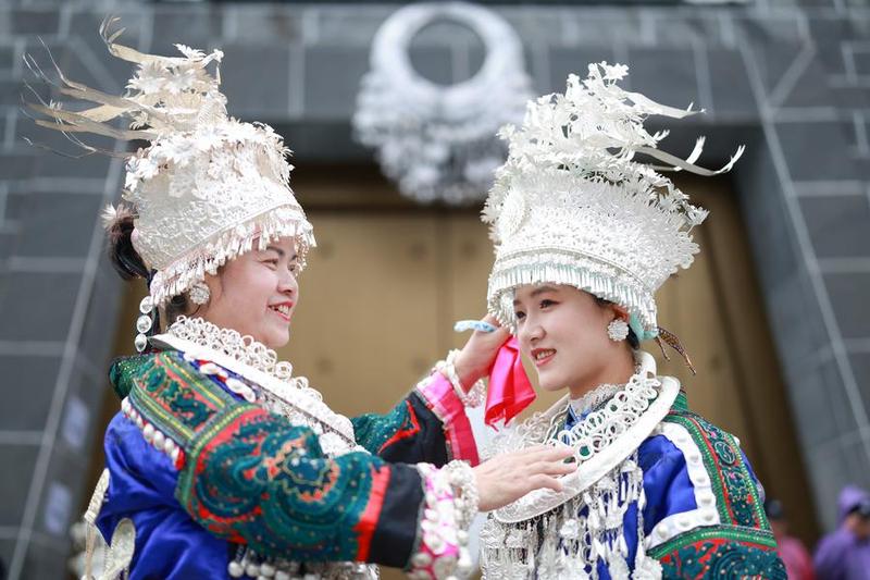 في الصور الملتقطة مواطنون محليون من قومية مياو في مراسم الاحتفال بعيد الأخوات التقليدي لقومية مياو في محافظة تايجيانغ بمقاطعة قويتشو في جنوب غربي الصين.