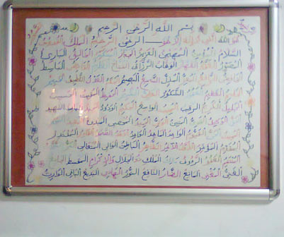 هذا الطابع الاسلامي يمكن ملاحظته من خلال الرسومات على الجدران، التي تحوي كلمات إسلامية، ومنها أسماء الله الحسنى، ومن خلال أسماء الطلاب في الصفوف، فهذا إبراهيم، وهذا محمد، وهذا يوسف.